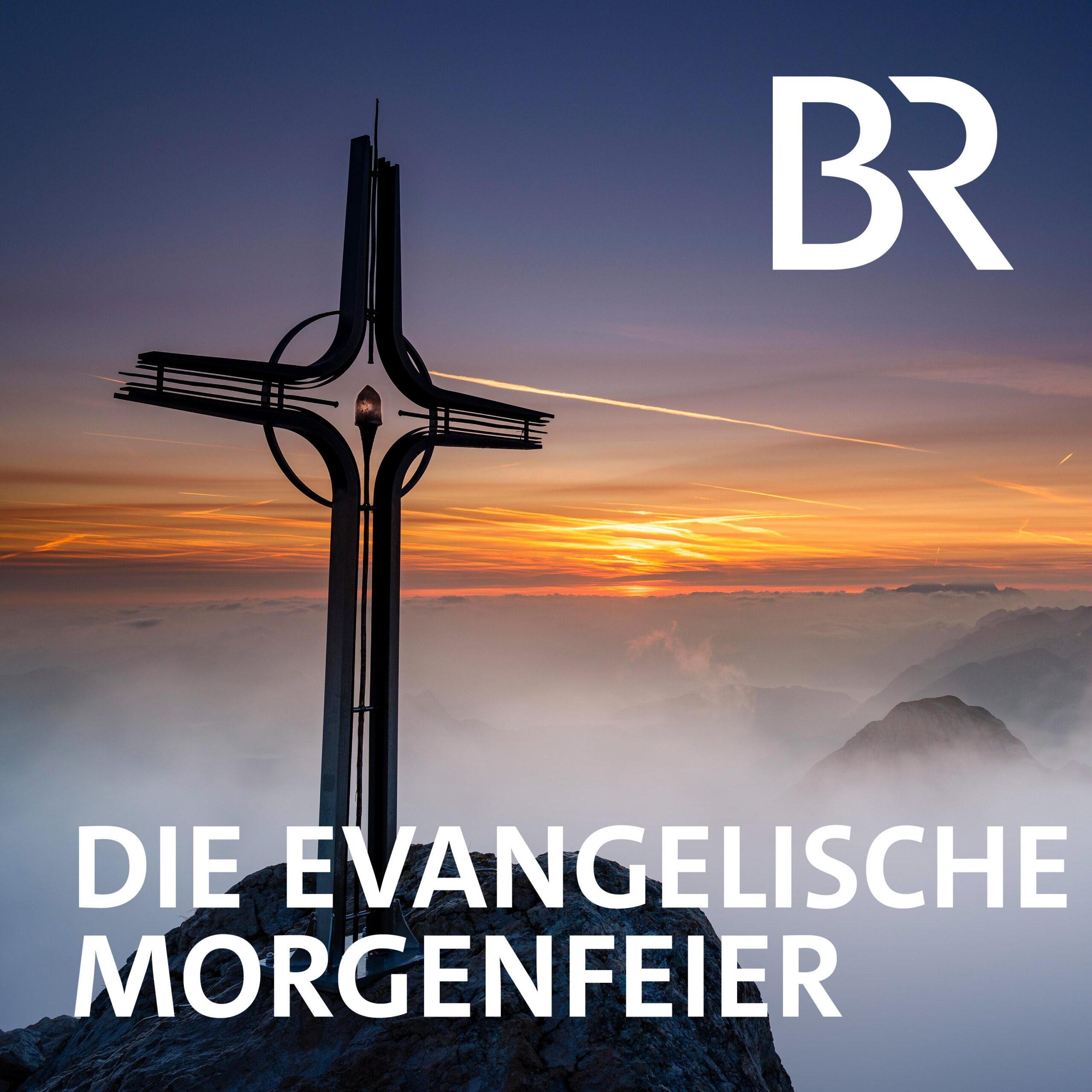 Ein Metallkreuz steht bei Sonnenaufgang auf einem Berg, umgeben von Wolken. Der Text lautet BR in der Ecke und DIE EVANGELISCHE MORGENFEIER am unteren Rand.