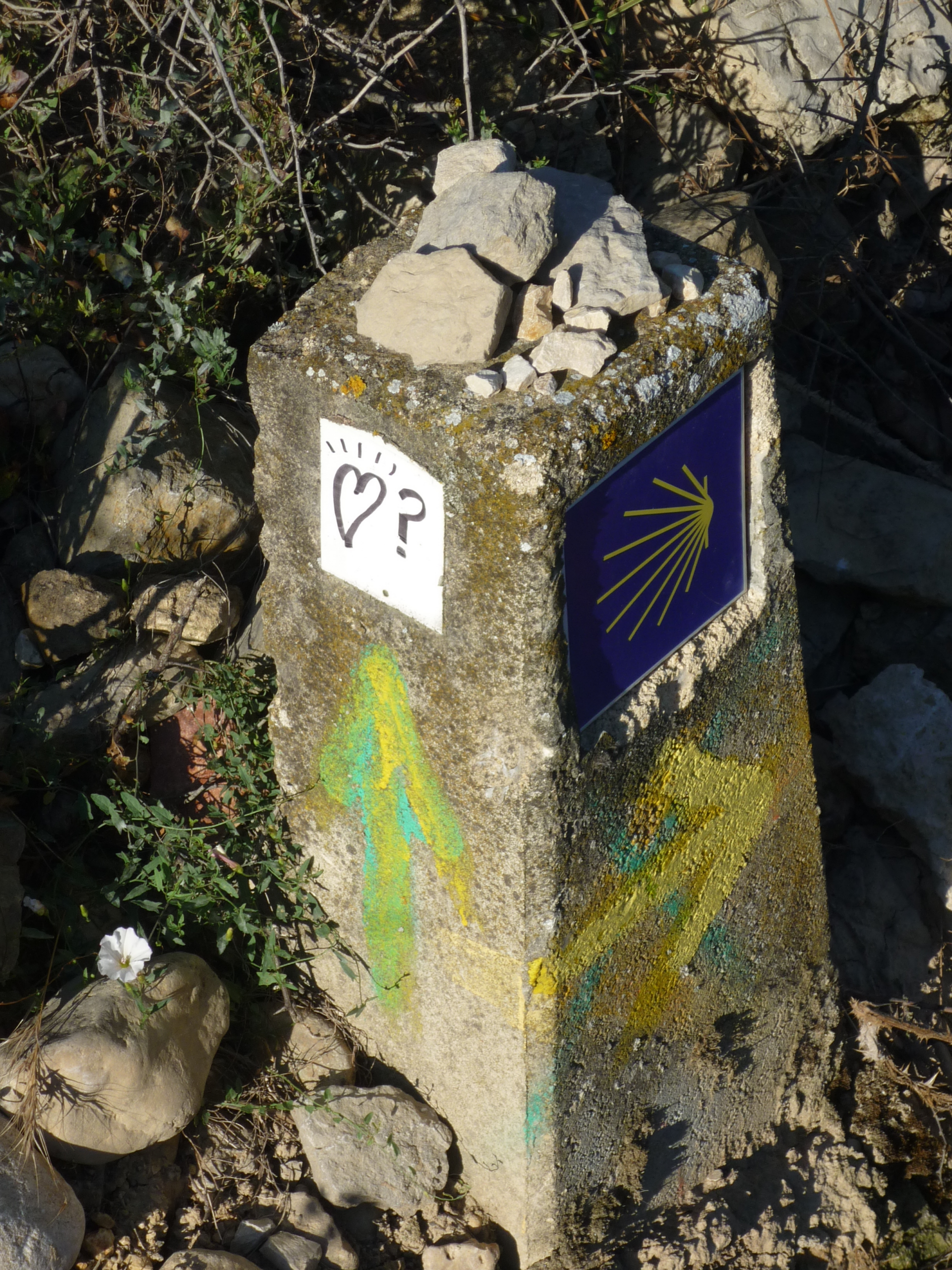 Betonstein mit einem Muschelsymbol, einem weißen Aufkleber mit einem Herz und einem Fragezeichen, grün und gelb gemalten Pfeilen, Steinen auf der Spitze, umgeben von Gras und Steinen.